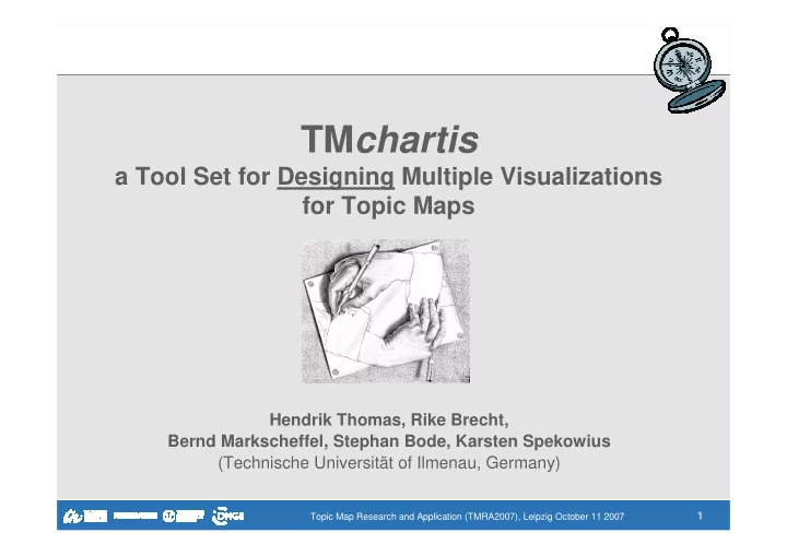 TM chartis a Tool Set for Designing Multiple Visualizations for Topic Maps Hendrik Thomas, Rike Brecht, Bernd Markscheffel, Stephan Bode, Karsten Spekowius (Technische Universität of Ilmenau, Germany) 1 Topic Map Research and Application (TMRA2007), Leipzig October 11 2007