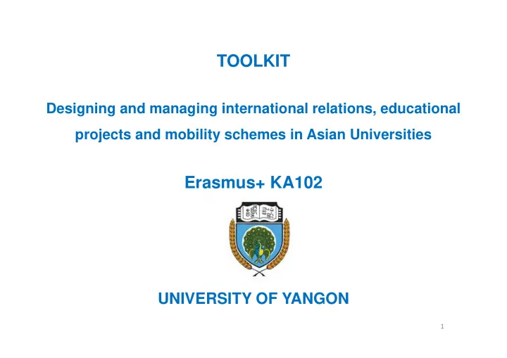 TOOLKIT Designing and managing international relations, educational projects and mobility schemes in Asian Universities Erasmus+ KA102 UNIVERSITY OF YANGON 1