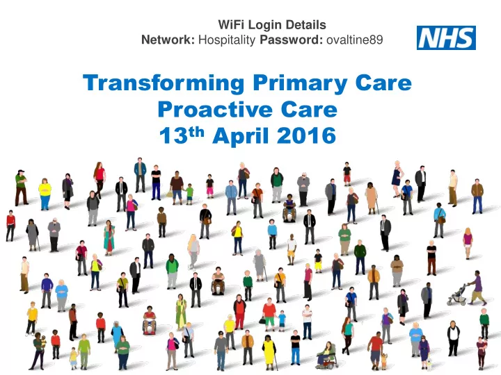 WiFi Login Details Network: Hospitality Password: ovaltine89 Transforming Primary Care Proactive Care 13 th April 2016