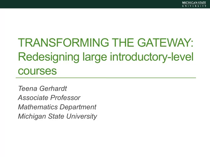 TRANSFORMING THE GATEWAY: Redesigning large introductory-level courses Teena Gerhardt Associate Professor Mathematics Department Michigan State University