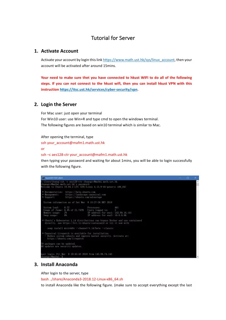 Tut utorial al for Ser erver er 1. Activate Account Activate your account by login this link https://www.math.ust.hk/sys/linux_account, then your account will be activated after around 15mins. Your need to make sure thet you have connected to hkust WIFI to do all of the following steps. If you can not connect to the hkust wifi, then you can install hkust VPN with this instruction https://itsc.ust.hk/services/cyber-security/vpn. 2. Login the Server For Mac user: just open your terminal For Win10 user: use Win+R and type cmd to open the windows terminal. The following figures are based on win10 terminal which is similar to Mac. After opening the terminal, type ssh your_account@mafm1.math.ust.hk or ssh –c aes128-ctr your_account@mafm1.math.ust.hk then typing your password and waiting for about 1mins, you will be able to login successfully with the following figure. 3. Install Anaconda After login to the server, type bash ../share/Anaconda3-2018.12-Linux-x86_64.sh to install Anaconda like the following figure. (make sure to accept everything except the last