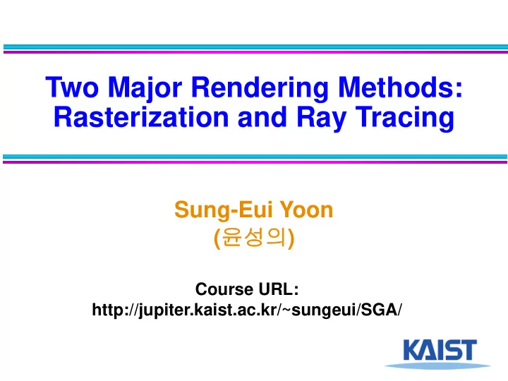 Two Major Rendering Methods: Rasterization and Ray Tracing Sung-Eui Yoon ( 윤성의 ) Course URL: http://jupiter.kaist.ac.kr/~sungeui/SGA/