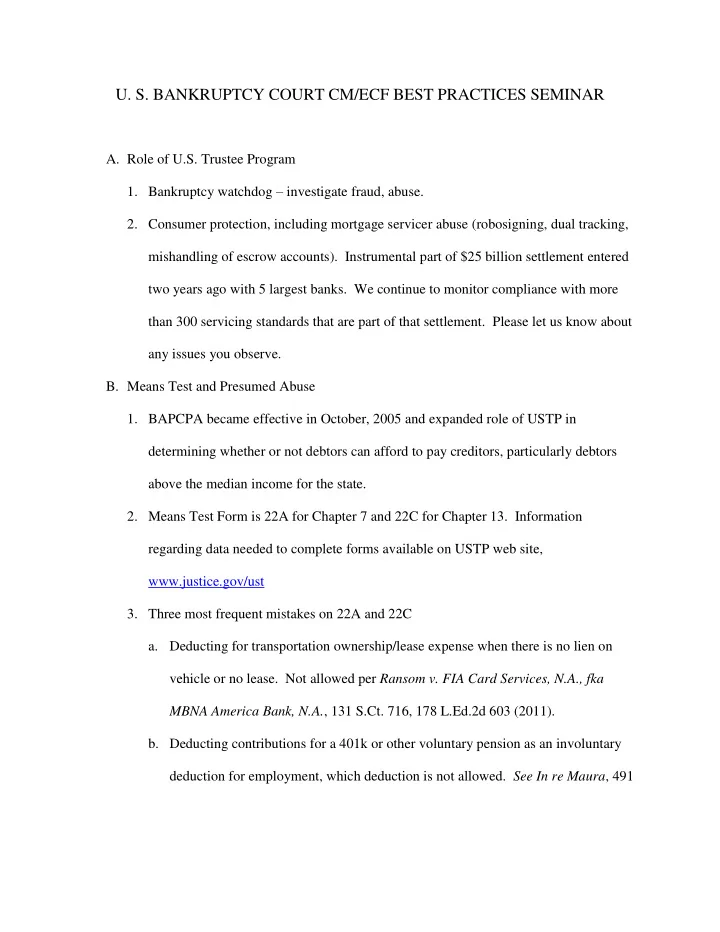 U. S. BANKRUPTCY COURT CM/ECF BEST PRACTICES SEMINAR A. Role of U.S. Trustee Program 1. Bankruptcy watchdog – investigate fraud, abuse. 2. Consumer protection, including mortgage servicer abuse (robosigning, dual tracking, mishandling of escrow accounts). Instrumental part of $25 billion settlement entered two years ago with 5 largest banks. We continue to monitor compliance with more than 300 servicing standards that are part of that settlement. Please let us know about any issues you observe. B. Means Test and Presumed Abuse 1. BAPCPA became effective in October, 2005 and expanded role of USTP in determining whether or not debtors can afford to pay creditors, particularly debtors above the median income for the state. 2. Means Test Form is 22A for Chapter 7 and 22C for Chapter 13. Information regarding data needed to complete forms available on USTP web site, www.justice.gov/ust 3. Three most frequent mistakes on 22A and 22C a. Deducting for transportation ownership/lease expense when there is no lien on vehicle or no lease. Not allowed per Ransom v. FIA Card Services, N.A., fka MBNA America Bank, N.A. , 131 S.Ct. 716, 178 L.Ed.2d 603 (2011). b. Deducting contributions for a 401k or other voluntary pension as an involuntary deduction for employment, which deduction is not allowed. See In re Maura , 491