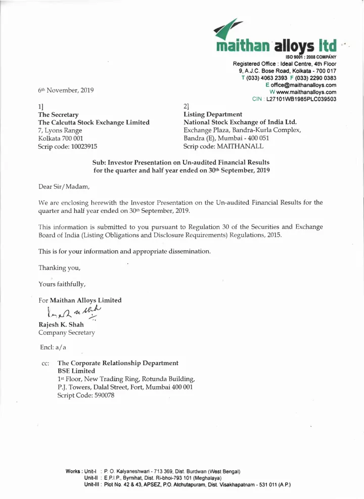 Registered Office : ldealCentre, 4th Floor 9, A.J.C. Bose Road, Kolkata -700 017 r (033) 4063 2393 F (033) 2290 0383 E office@maithanalloys'com 6th Novemb er,207g W wwwmaithanalloys.com CIN : L27101WBl 985P1C039503 u2l The Secretary Listing Department The Calcutta Stock Exchange Limited National Stock Exchange of India Ltd. T,Lyons Range Exchange Plaza, Bandra-Kurla Complex, Kolkata 700 001 Bandra (E), Mumbai - 400 051 Scrip code: 10023915 Scrip code: MAITHANALL Sub: Investor Presentation on Un-audited Financial Results for the quarter and half year ended on 30th September,2019 Dear Sir/Madam, We are enclosing herewith the Investor Presentation on the Un-audited Financial Results for the quarter and haU year ended on 30tt September ,2079. This information is submitted to you pursuant to Regulation 30 of the Securities and Exchange Board of India (Listing Obligations and Disclosure Requirements) Regulations, 2015. This is for your information and appropriate dissernination. Thanking you, Yours faithfully, For Maithan Alloys Limited l,=a)-^ /'o/1 Rajesh K. Shah Company Secretary Encl: a/a cc: The Corporate Relationship Department BSE Limited 1't Floor, New Trading Ring, Rotunda Building, P.J. Towers, Dalal Street, Fort, Mumbai 400 001 Script Code: 590078 Works:Unit-l : P O. Kalyaneshwari - 713 369, Dist. Burdwan (West Bengal) Unit-ll : E P.l P, Byrnihat, Dist. Ri-bhoi-793 101 (Meghalaya) Unit-lll : Plot No. 42 & 43,APSEZ, P.O. Atdrutapuram, Dist. Msakhapatnam - 531 011 (A.P.)