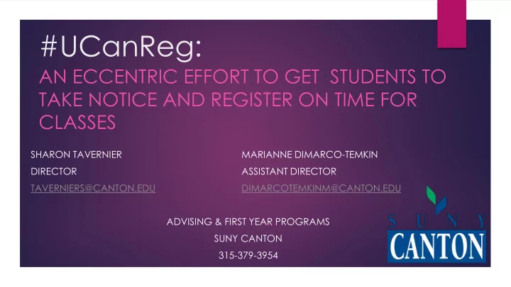 #UCanReg: AN ECCENTRIC EFFORT TO GET STUDENTS TO TAKE NOTICE AND REGISTER ON TIME FOR CLASSES SHARON TAVERNIER MARIANNE DIMARCO-TEMKIN DIRECTOR ASSISTANT DIRECTOR TAVERNIERS@CANTON.EDU DIMARCOTEMKINM@CANTON.EDU ADVISING & FIRST YEAR PROGRAMS SUNY CANTON 315-379-3954