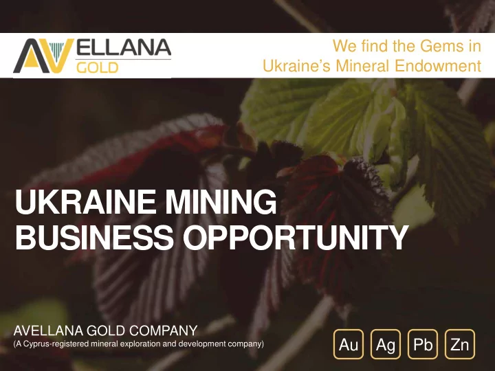 We find the Gems in Ukraine’s Mineral Endowment UKRAINE MINING BUSINESS OPPORTUNITY AVELLANA GOLD COMPANY Au Ag Pb Zn (A Cyprus-registered mineral exploration and development company)