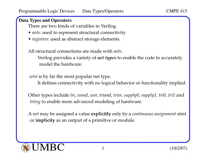 Programmable Logic Devices Data Types/Operators CMPE 415 Data Types and Operators There are two kinds of variables in Verilog. • nets : used to represent structural connectivity • registers : used as abstract storage elements. All structural connections are made with nets . Verilog provides a variety of net types to enable the code to accurately model the hardware. wire is by far the most popular net type. It defines connectivity with no logical behavior or functionality implied. Other types include tri , wand , wor , triand , trior, supply0 , supply1, tri0 , tri1 and trireg to enable more advanced modeling of hardware. A net may be assigned a value explicitly only by a continuous assignment stmt or implicity as an output of a primitive or module. L A N R Y D UMBC A B M A L T F O U M B C I M Y O R T 1 (10/2/07) I E S R C E O V U I N N U T Y 1 6 9 6