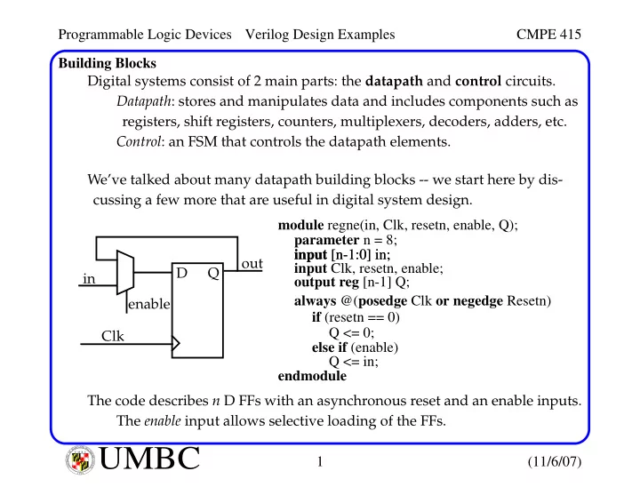 Programmable Logic Devices Verilog Design Examples CMPE 415 Building Blocks Digital systems consist of 2 main parts: the datapath and control circuits. Datapath : stores and manipulates data and includes components such as registers, shift registers, counters, multiplexers, decoders, adders, etc. Control : an FSM that controls the datapath elements. We’ve talked about many datapath building blocks -- we start here by dis- cussing a few more that are useful in digital system design. module regne(in, Clk, resetn, enable, Q); parameter n = 8; input [n-1:0] in; input [n-1:0] in; out input Clk, resetn, enable; D Q in output reg [n-1] Q; always @( posedge Clk or negedge Resetn) enable if (resetn == 0) Q <= 0; Clk else if (enable) Q <= in; endmodule The code describes n D FFs with an asynchronous reset and an enable inputs. The enable input allows selective loading of the FFs. L A N R Y D UMBC A B M A L T F O U M B C I M Y O R T 1 (11/6/07) I E S R C E O V U I N N U T Y 1 6 9 6