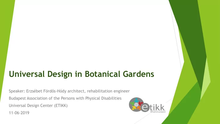 Universal Design in Botanical Gardens Speaker : Erzsébet Fördős - Hódy architect, rehabilitation engineer Budapest Association of the Persons with Physical Disabilities Universal Design Center (ETIKK) 11-06-2019