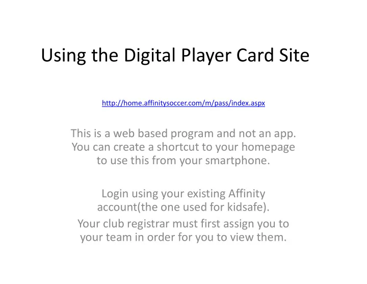 Using the Digital Player Card Site http://home.affinitysoccer.com/m/pass/index.aspx This is a web based program and not an app. You can create a shortcut to your homepage to use this from your smartphone. Login using your existing Affinity account(the one used for kidsafe). Your club registrar must first assign you to your team in order for you to view them.