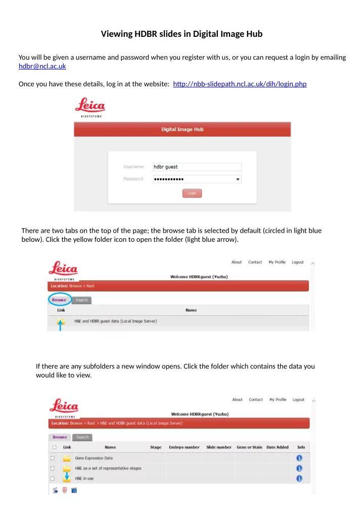 Viewing HDBR slides in Digital Image Hub You will be given a username and password when you register with us, or you can request a login by emailing hdbr@ncl.ac.uk Once you have these details, log in at the website: htup://nbb-slidepath.ncl.ac.uk/dih/login.php There are two tabs on the top of the page; the browse tab is selected by default (circled in light blue below). Click the yellow folder icon to open the folder (light blue arrow). If there are any subfolders a new window opens. Click the folder which contains the data you would like to view.