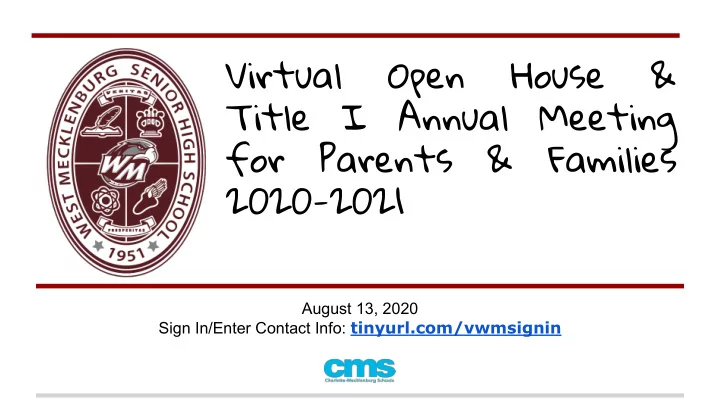 Virtual Open House & Title I Annual Meeting for Parents & Families 2020-2021 August 13, 2020 Sign In/Enter Contact Info: tinyurl.com/vwmsignin