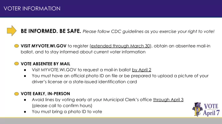 VOTER INFORMATION BE INFORMED. BE SAFE. Please follow CDC guidelines as you exercise your right to vote! VISIT MYVOTE.WI.GOV to register (extended through March 30), obtain an absentee mail-in ballot, and to stay informed about current voter information VOTE ABSENTEE BY MAIL Visit MYVOTE.WI.GOV to request a mail-in ballot by April 2 ● You must have an official photo ID on file or be prepared to upload a picture of your ● driver’s license or a state-issued identification card VOTE EARLY, IN-PERSON Avoid lines by voting early at your Municipal Clerk’s office through April 3 ● (please call to confirm hours) You must bring a photo ID to vote ●