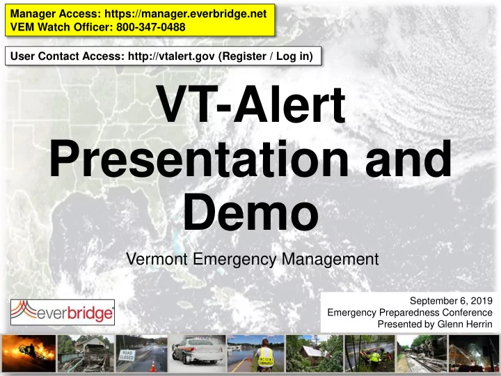 Manager Access: https://manager.everbridge.net VEM Watch Officer: 800-347-0488 User Contact Access: http://vtalert.gov (Register / Log in) VT-Alert Presentation and Demo Vermont Emergency Management September 6, 2019 Emergency Preparedness Conference Presented by Glenn Herrin