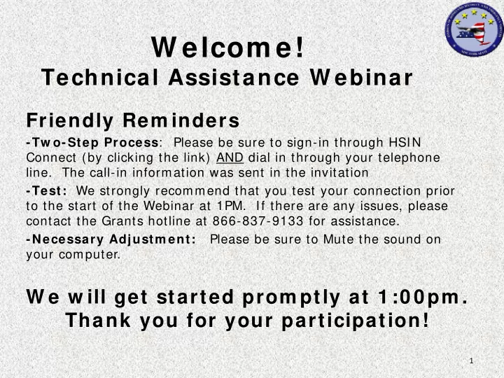 W elcom e! Technical Assistance W ebinar Friendly Rem inders -Tw o-Step Process : Please be sure to sign-in through HSIN Connect (by clicking the link) AND dial in through your telephone line. The call-in information was sent in the invitation -Test: We strongly recommend that you test your connection prior to the start of the Webinar at 1PM. If there are any issues, please contact the Grants hotline at 866-837-9133 for assistance. -Necessary Adjustm ent: Please be sure to Mute the sound on your computer. W e w ill get started prom ptly at 1 :0 0 pm . Thank you for your participation! 1
