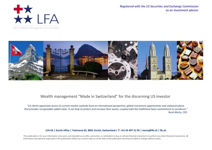 Registered with the US Securities and Exchange Commission as an investment advisor Wealth management “Made in Switzerland” for the discerning US investor “US clients appreciate access to current market outlooks from an international perspective, global investment opportunities and unbiased advice that provides recognizable added value. It can help to protect and increase their assets, coupled with the traditional Swiss commitment to excellence.” René Marty, CEO LFA SA | Zurich office | Talstrasse 65, 8001 Zurich, Switzerland | T: +41 43 497 21 05 | marty@lfa.ch | lfa.ch This publication is for your information only and is not intended as an offer, promotion, or solicitation to buy or sell any financial instrument or perform any other financial transactions. All information and opinions expressed in this publication reflect our current views as of the date of the publication and may be liable to change without notice.