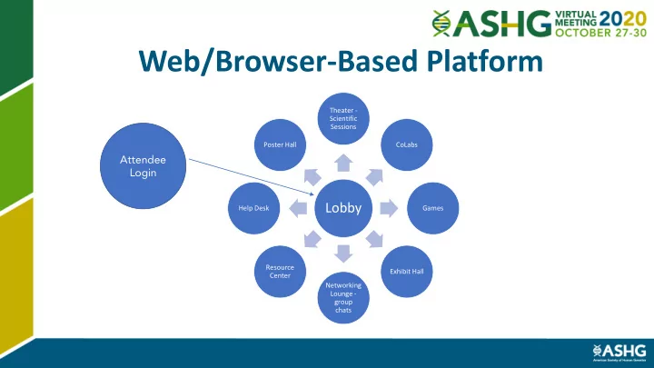 Web/Browser-Based Platform Theater - Scientific Sessions Poster Hall CoLabs Attendee Login Lobby Help Desk Games Resource Exhibit Hall Center Networking Lounge - group chats