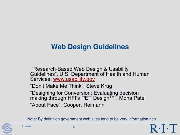 Web Design Guidelines “Research -Based Web Design & Usability Guidelines”, U.S. Department of Health and Human Services; www.usability.gov “Don’t Make Me Think”, Steve Krug “Designing for Conversion; Evaluating decision making through HFI’s PET Design TM ”, Mona Patel “About Face”, Cooper, Reimann Note: By definition government web sites tend to be very information rich R. Kuehl p. 1 R I T Software Engineering