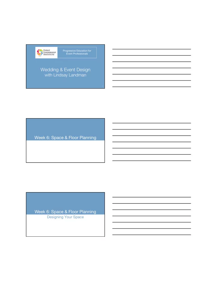 10/26/15 Progressive Education for Event Professionals Wedding & Event Design ! with Lindsay Landman ! 1 1 Week 6: Space & Floor Planning 2 Week 6: Space & Floor Planning Designing Your Space 3 1