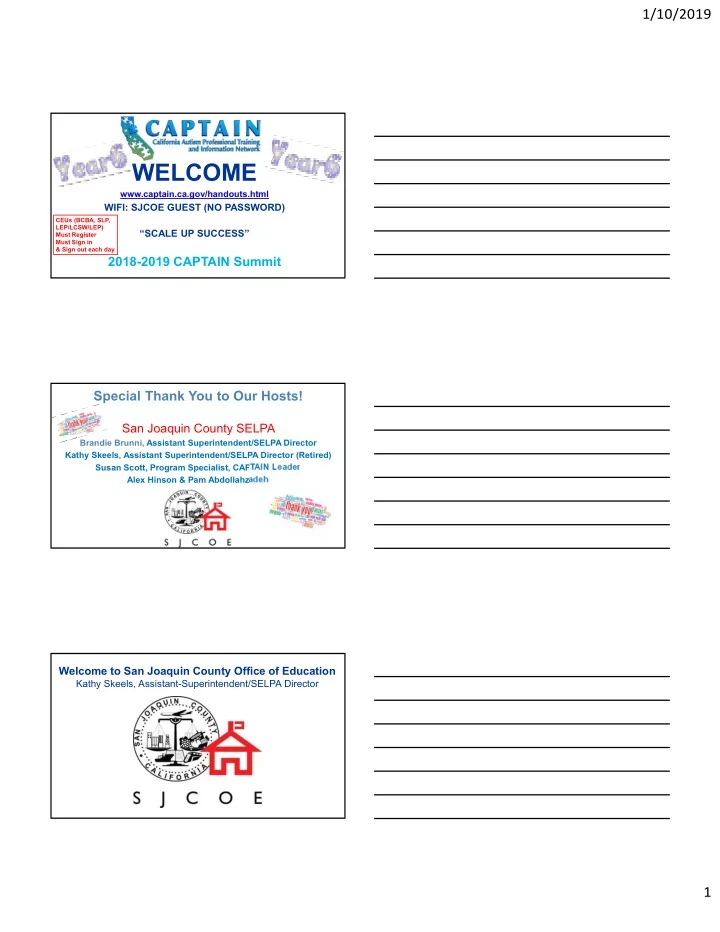 1/10/2019 WELCOME www.captain.ca.gov/handouts.html WIFI: SJCOE GUEST (NO PASSWORD) CEUs (BCBA, SLP, LEP/LCSW/LEP) “SCALE UP SUCCESS” Must Register Must Sign in & Sign out each day 2018-2019 CAPTAIN Summit Special Thank You to Our Hosts! San Joaquin County SELPA Brandie Brunni, Assistant Superintendent/SELPA Director Kathy Skeels, Assistant Superintendent/SELPA Director (Retired) Susan Scott, Program Specialist, CAPTAIN Leader Alex Hinson & Pam Abdollahzadeh Welcome to San Joaquin County Office of Education Kathy Skeels, Assistant-Superintendent/SELPA Director 1