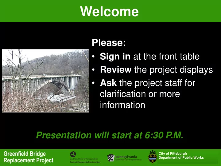 Thanks for Attending Project Website: • http://greenfieldbridge.otmapgh.org Please: • Sign in at the front table • Review the displays and ask questions of the project staff City of Pittsburgh Department of Public Works