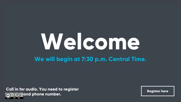 Welcome We will begin at 7:30 p.m. Central Time. Call in for audio. You need to register Register here for a pin and phone number.
