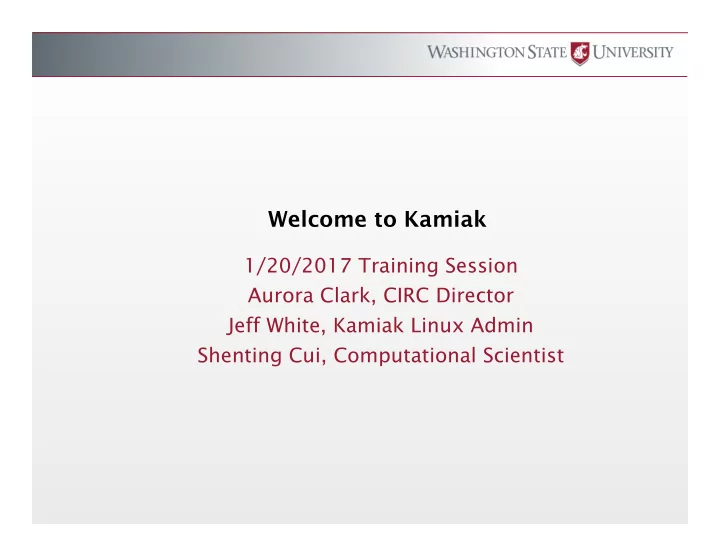 Welcome to Kamiak 1/20/2017 Training Session Aurora Clark, CIRC Director Jeff White, Kamiak Linux Admin Shenting Cui, Computational Scientist