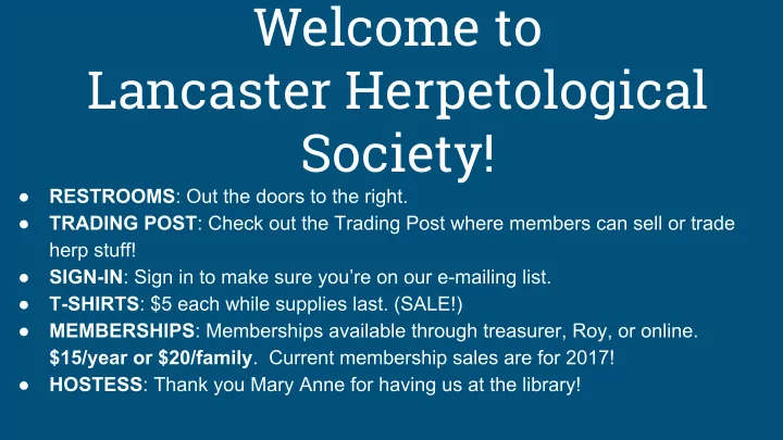Welcome to Lancaster Herpetological Society! ● RESTROOMS : Out the doors to the right. ● TRADING POST : Check out the Trading Post where members can sell or trade herp stuff! ● SIGN-IN : Sign in to make sure you’re on our e-mailing list. ● T-SHIRTS : $5 each while supplies last. (SALE!) ● MEMBERSHIPS : Memberships available through treasurer, Roy, or online. $15/year or $20/family . Current membership sales are for 2017! ● HOSTESS : Thank you Mary Anne for having us at the library!