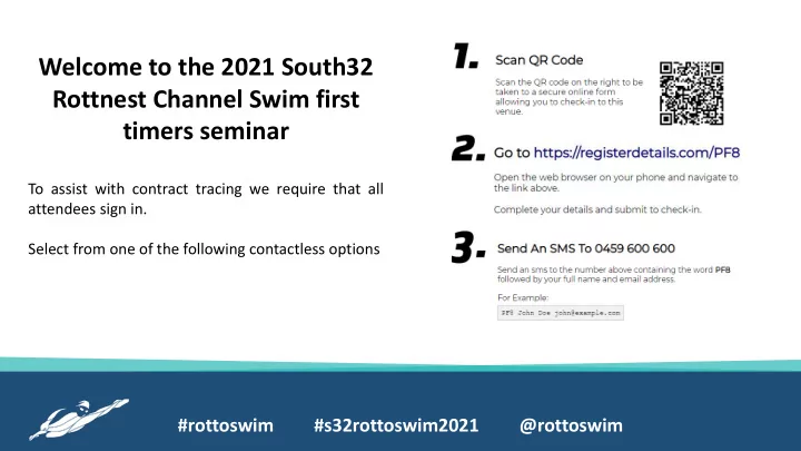 Welcome to the 2021 South32 Rottnest Channel Swim first timers seminar To assist with contract tracing we require that all attendees sign in. Select from one of the following contactless options #rottoswim #s32rottoswim2021 @rottoswim