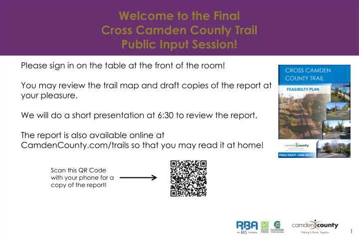 Welcome to the Final Cross Camden County Trail Public Input Session! Please sign in on the table at the front of the room! You may review the trail map and draft copies of the report at your pleasure. We will do a short presentation at 6:30 to review the report. The report is also available online at CamdenCounty.com/trails so that you may read it at home! Scan this QR Code with your phone for a copy of the report! 1