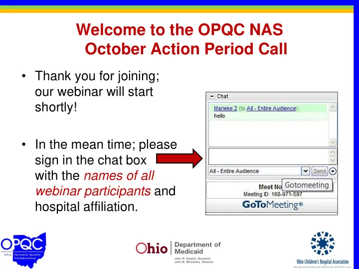 Welcome to the OPQC NAS October Action Period Call • Thank you for joining; our webinar will start shortly! • In the mean time; please sign in the chat box with the names of all webinar participants and hospital affiliation.