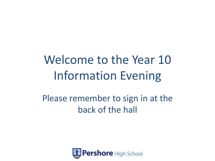 Welcome to the Year 10 Information Evening Please remember to sign in at the back of the hall