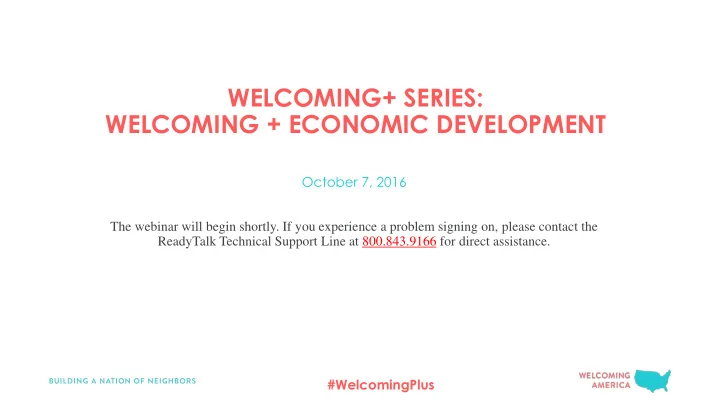 WELCOMING+ SERIES: WELCOMING + ECONOMIC DEVELOPMENT October 7, 2016 The webinar will begin shortly. If you experience a problem signing on, please contact the ReadyTalk Technical Support Line at 800.843.9166 for direct assistance. #WelcomingPlus