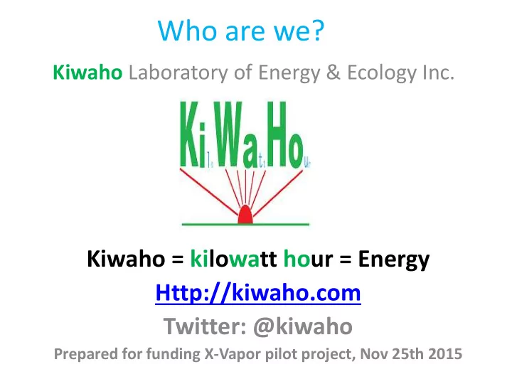 Who are we? Kiwaho Laboratory of Energy & Ecology Inc. Kiwaho = kilowatt hour = Energy Http://kiwaho.com Twitter: @kiwaho Prepared for funding X-Vapor pilot project, Nov 25th 2015