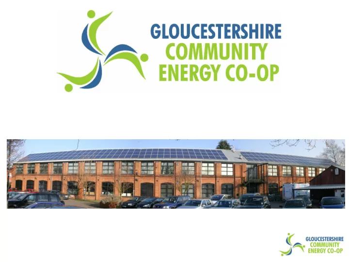 Who we are • Formed from the Stroud based Five Valleys Energy (FiVE) Co-operative registered under the Industrial and Provident Societies Acts in 2010 • Completed install of our first project at Gloucester Resource Centre in December 2011, with share issue to repay loans completed in April 2012. • Formally changed our name to GCEC in 2012, then re- registered, still under IPSA, from a Co-op to a “ Bencom ” in 2013