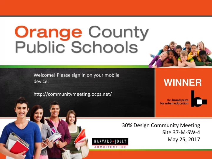 Orange County Public Schools Welcome! Please sign in on your mobile WINNER device: http://communitymeeting.ocps.net/ 30% Design Community Meeting Site 37-M-SW-4 May 25, 2017