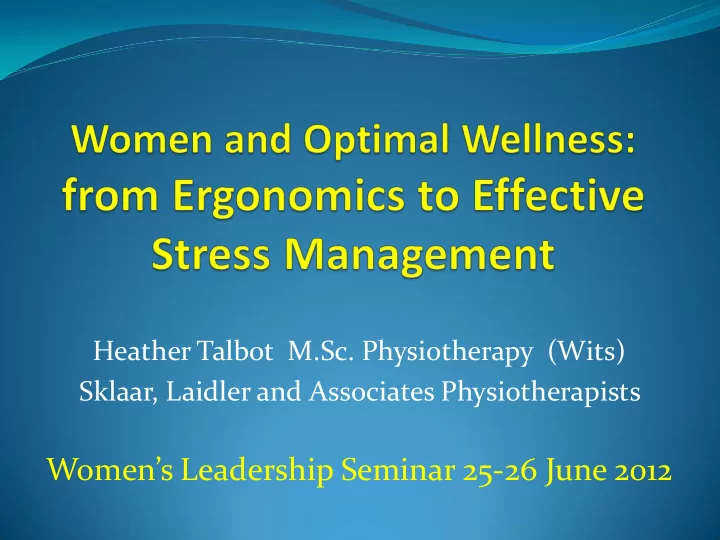 Heather Talbot M.Sc. Physiotherapy (Wits) Sklaar, Laidler and Associates Physiotherapists Women’s Leadership Seminar 25 -26 June 2012