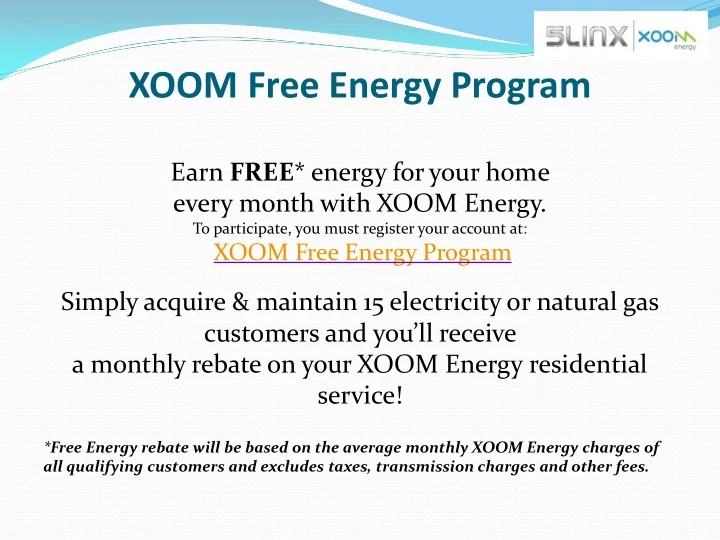 XOOM Free Energy Program Earn FREE * energy for your home every month with XOOM Energy. To participate, you must register your account at: XOOM Free Energy Program Simply acquire & maintain 15 electricity or natural gas customers and you’ll receive a monthly rebate on your XOOM Energy residential service! *Free Energy rebate will be based on the average monthly XOOM Energy charges of all qualifying customers and excludes taxes, transmission charges and other fees.