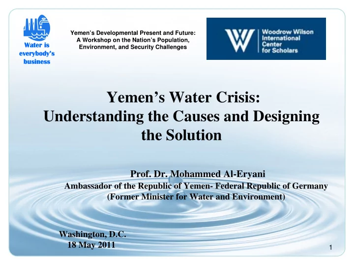 Yemen’s Developmental Present and Future: A Workshop on the Nation’s Population, Water is Water is Environment, and Security Challenges everybod eve ybody’s y’s business business Yemen’s Water Crisis: Understanding the Causes and Designing the Solution Prof. Dr. Mohammed Al-Eryani Ambassador of the Republic of Yemen- Federal Republic of Germany (Former Minister for Water and Environment) Washington, D.C. 18 May 2011 1